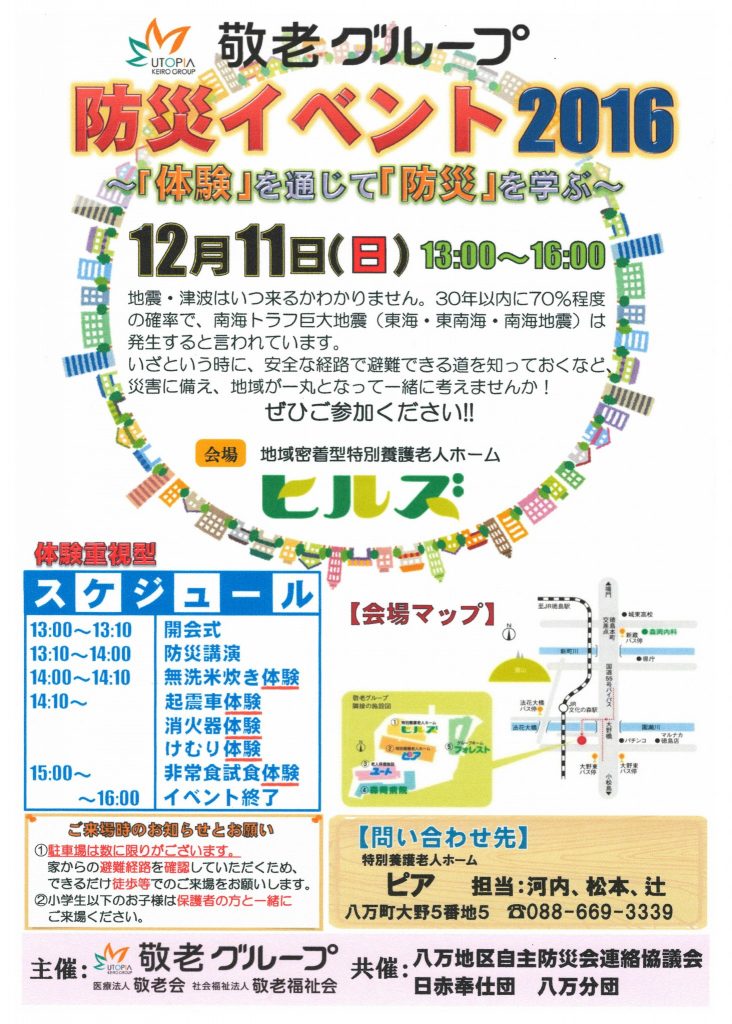 敬老グループでは、地域住民の皆様を対象とした防災イベント2016を開催します。 子供から大人まで、幅広い世代が、防災の「体験」を通じて、学んでいただけるイベントです。 多くの皆様のご来場をお待ちしております。