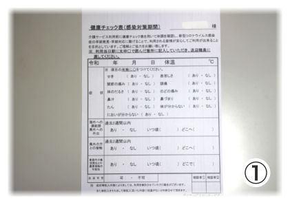①健康チェック表の確認・・・新型コロナウイルス感染症の諸症状や渡航歴などが見受けられる場合には、通所サービスのご利用を中止していただきます。