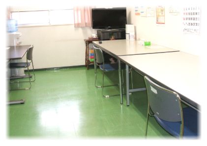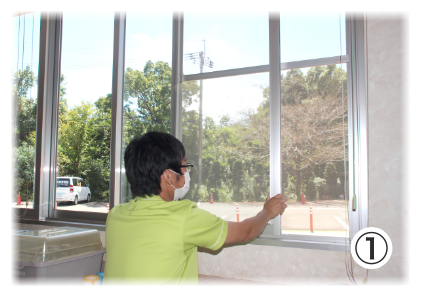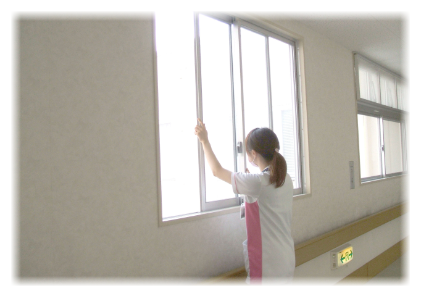 ①デイルーム内の換気・・・定時と随時でデイルーム内の換気を行い、密閉空間とならないように努めています。