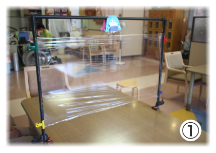 ①ストレッチフィルムやアクリルボードなど用いた飛沫感染予防・・・各テーブルに対面着席時の飛沫予防を設置しています。