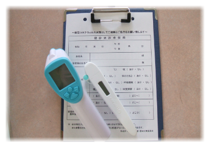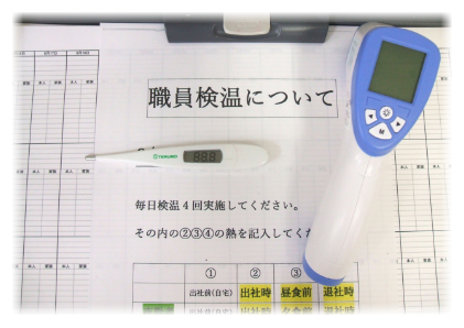 出勤前・出勤時・昼食前・退勤時の体温測定と健康チェック表を用いての体調確認を実施しています。