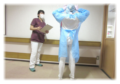 全職種ガウンテクニック習得に向け、ガウンテクニック評価表に基づき、指導をしています。