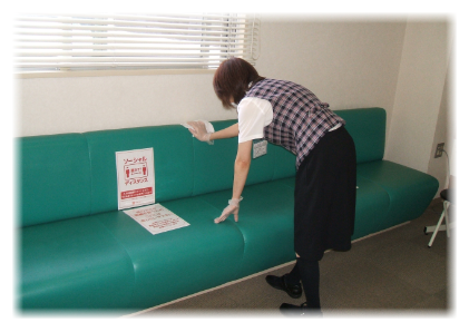 不特定の方が触れる可能性のあるドアノブ、椅子や手すりなど、毎日 次亜塩素酸ナトリウム(0.1%)による拭き取り消毒を実施し接触感染予防に努めています。