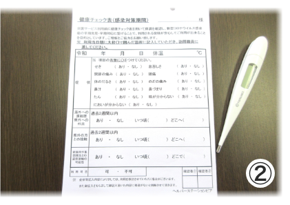 ②健康チェック表の記入・・・健康チェック表に体温や新型コロナウイルス感染症の諸症状などを記入いただきます。