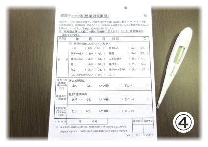 ④健康チェック(体調確認・体温計測定・健康チェック表記録)