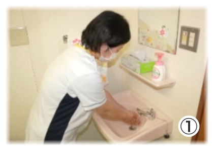 ①ご利用者の方の洗面台をお借りし手洗い・手指消毒