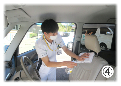 ③送迎車輌の拭き取り消毒・・・次亜塩素酸ナトリウム液(0.1%)を用いて拭き取り消毒を行っています。