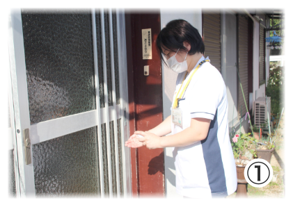 ①ご利用者の方の(玄関前)にて手指消毒し入室